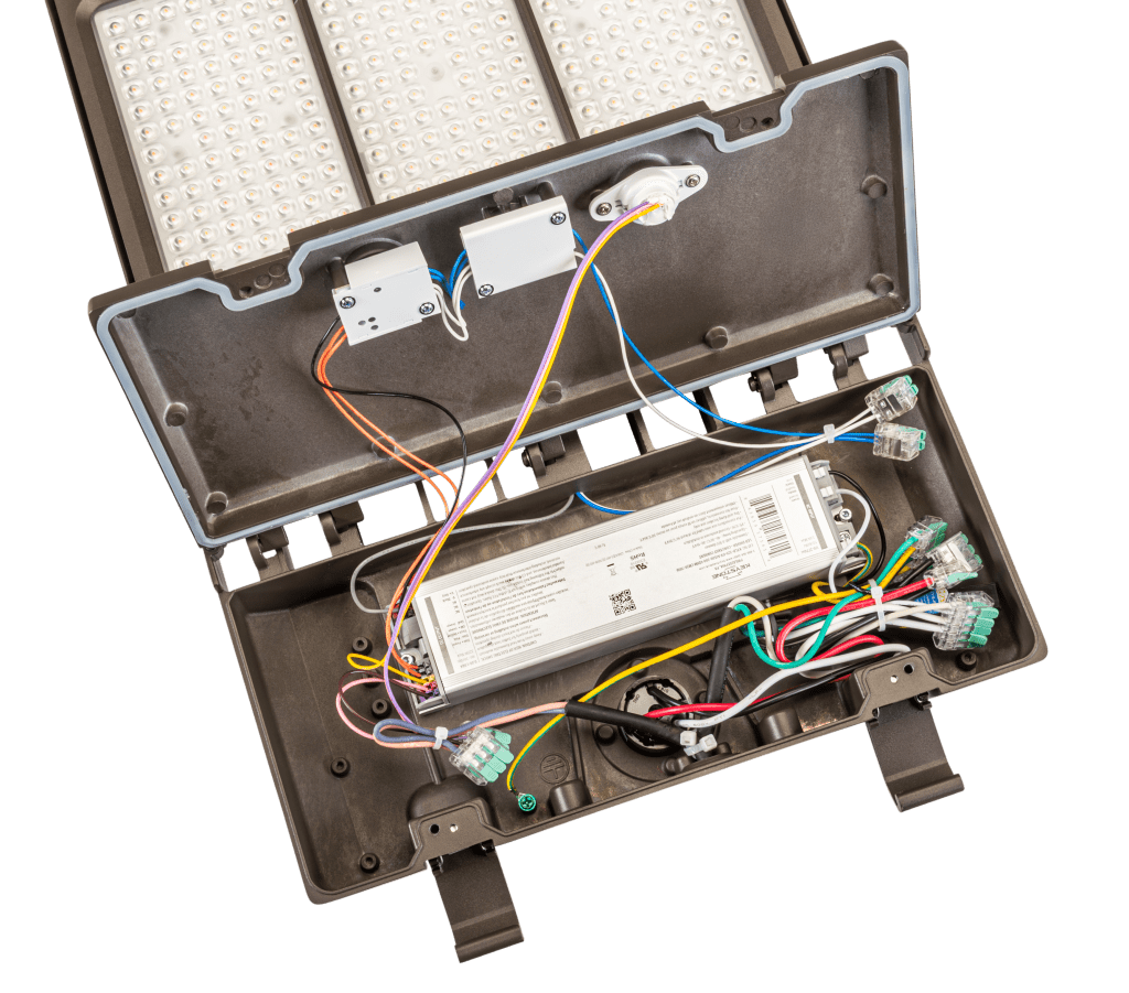Our drivers are 100% end-of-line tested, rugged, and reliable. They feature 0-10V dimming and offer ample surge protection for increased versatility and durability. No tools are required to open the compartment, and the driver features a safety mechanism that automatically cuts power to LEDs when the door frame is open.